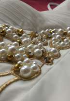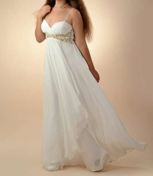 Материал : 95% polyester, 5% elastik Роскошное вечернее платье в пол идеально для выпускного, свадьбы или фотоссесии. Подойдёт на любую фигуру. Под грудью ажурная вышивка с жемчугом (все камушки на месте). Состояние : надевалось на часовую фотоссесию, следов носки нет.