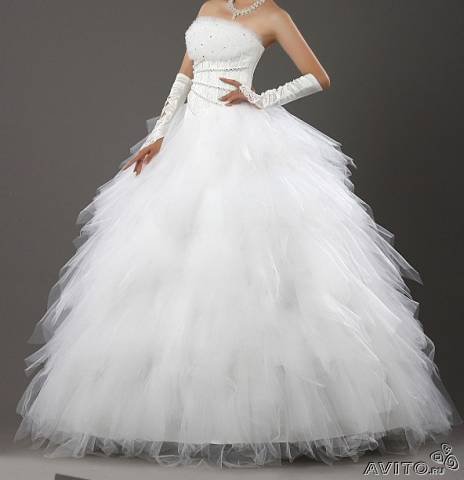 Пышная юбка из фатина, на корсете на груди небольшая пышная отделка из кусочков фатина, украшенная стразами. Корсет регулируется на спинке шнуровкой. Покупательнице в подарок будут перчатки, подходящие по цвету, абсолютно новые!