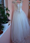 Красивое изящное свадебное платье цвета шампанского со шнуровкой. На корсете кружево с золотистой каймой и со стразами, пышная фатиновая юбка. Покупала новое и надевала 1 раз на свадьбу. Очень удобное, легкое, без повреждений.