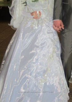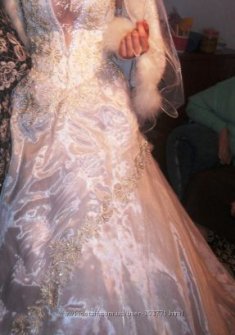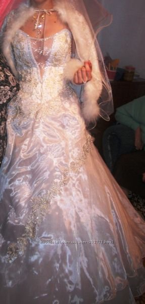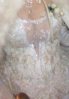 Продам красивое свадебное платье. Идеальное состояние. Размер 40-44 (по необходимости сделаю замеры). В подарок перчатки и кольца под платье . Еще фото вышлю по запросу. Мой рост 158 + каблук 9 см. Размер регулируется шнуровкой. Есть диадема и бижутерия. В реале намного красивей, чем на фото. Платье просто шикарное! Расшито "золотом".
