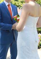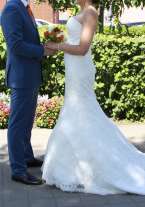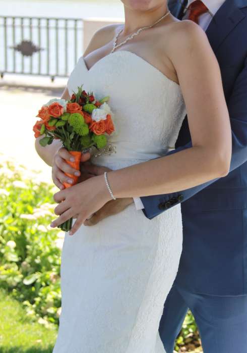 Свадебное платье цвет айвори, силуэт рыбка, на корсете. Имеется шлейф, который убирается на пуговичке. Подходит на российский размер 42-44-46. Состояние платья отличное, одевалось один раз и после сделана химчистка.