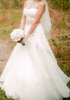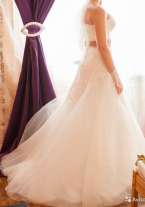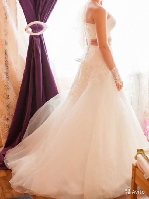 Платье формы А-силуэт. Открытые плечи. Корсет с регулировкой сзади. Украшенный пояс светло розового оттенка очень выгодно выделяется на фоне светлого цвета самого платья и подчеркивает силуэт. Подойдет на размер М (44-46), а также размер L (46-48). Платье после химчистки. Вместе с платьем в комплекте в подарок отдам кольца под юбку (2 кольца), чехол для хранения. Возможен торг.