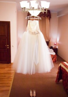 Платье цвета Ivory. Очень редкий и красивый цвет. Платье очень нежное и романтичное. Очень большой плюс - скрывает недостатки на линии талии. Легкое. Кольца прилагаются в комплекте.
