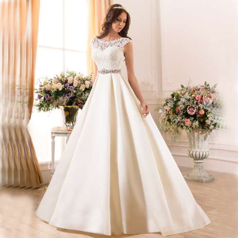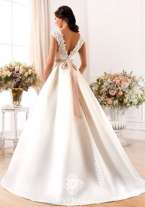 Изящное платье А-силуэта. Шикарный гипюровый кружевной верх с изысканным вырезом на спине, корсет платья очень утончает и подчеркивает талию. Корсет застегивается на молнии до выреза, а сверху идет ряд пуговиц до конца шлейфа,создавая эффектный декор.Шлейф можно поднять и подстегнуть при необходимости.Атласная юбка – один из дорогих,красивых материалов,который восхитительно мерцает и переливается! Платье имеет скрытые карманы, что очень удобно для невесты! К платью имеется чехол.Торг уместен.