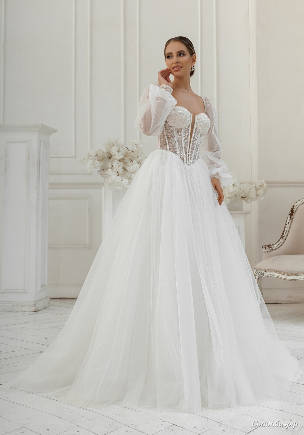 Шикарная свадебная модель, которая сочетает в себе несколько тканей. Полупрозрачный корсет из тонкого кружевного глиттера расшитого полупрозрачным стеклярусом. Пышные рукава из мерцающего фатина, можно спустить с плеч. Пышная юбка из многослойного фатина довершает образ.