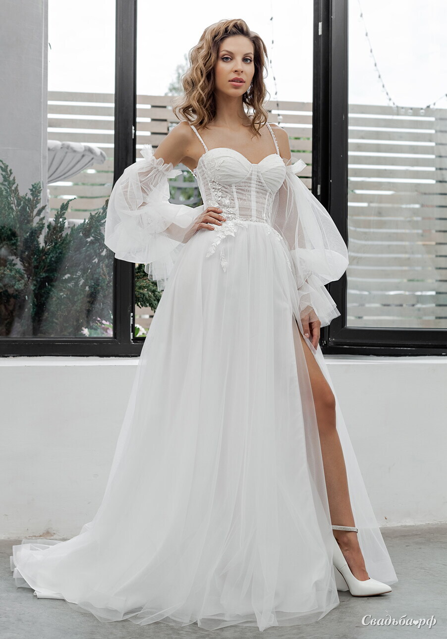 Свадебное платье из новой коллекции. Изящный корсет с бельевой чашкой, которая дополнена горизонтальной драпировкой. И минимум изящных кружев на прозрачном корсете расшиты тонкими аппликациями, талия и чашки расшиты прозрачными хрусталиками. Юбка выполнена из мягкого фатина с высоким разрезом по ножке. Изюминкой этой модели являются съемные рукава из мягкого фатина.