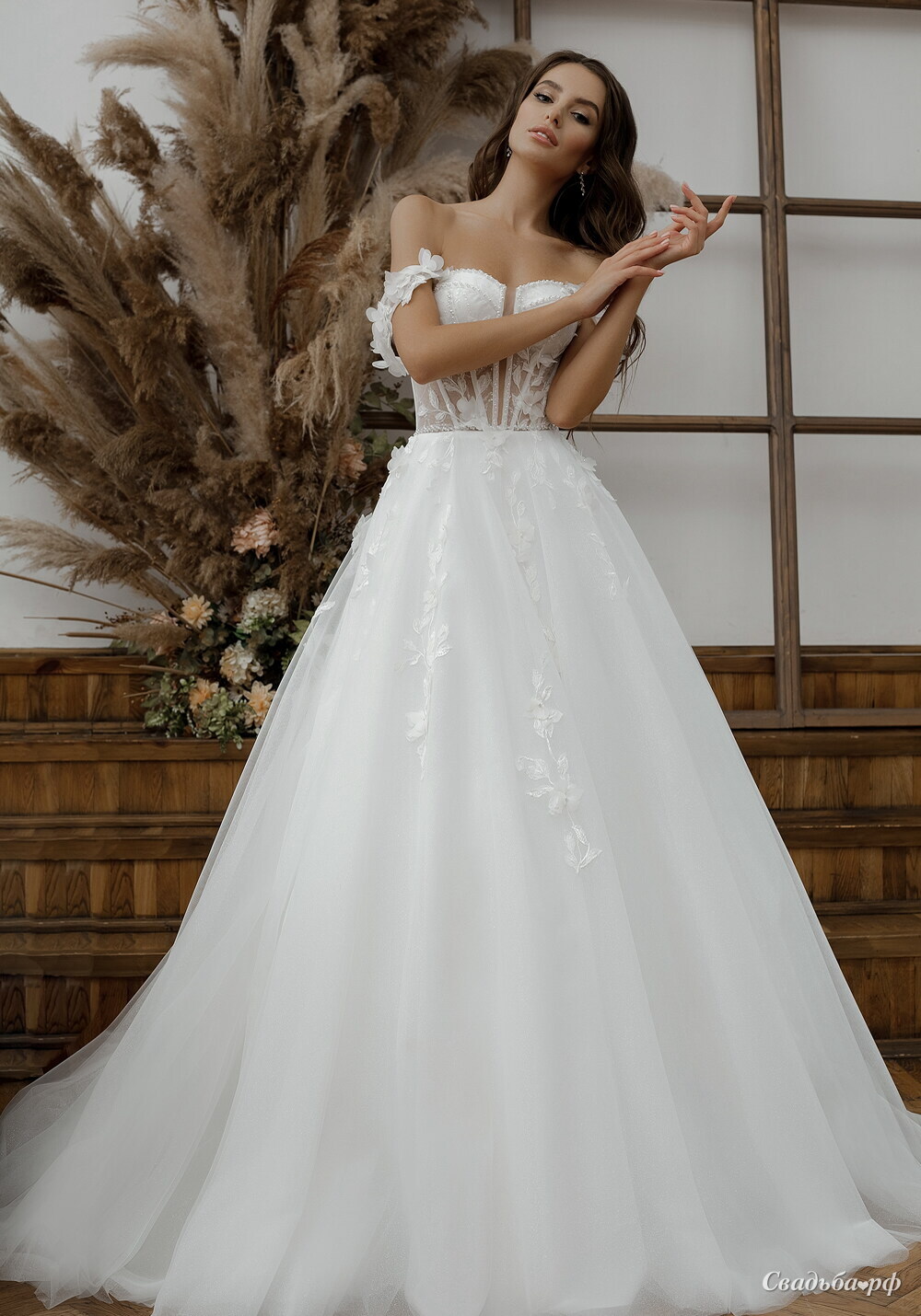 Уникальная модель из новой коллекции 2025 года. Свадебное платье с открытыми плечами и узкими съемными планками из тонкого кружева, которые можно снять в любой момент. Корсет в стиле фигаро с прямым вырезом. Корсет и планки украшены 3д кружевом, создает эффект эксклюзивности и неповторимости. Мерцающая юбка придает платью легкий шарм и фантастический блеск при перемещении во время торжественной части, юбка также дополнена кружевными аппликациями, которые еще больше подчеркивают шик платья.