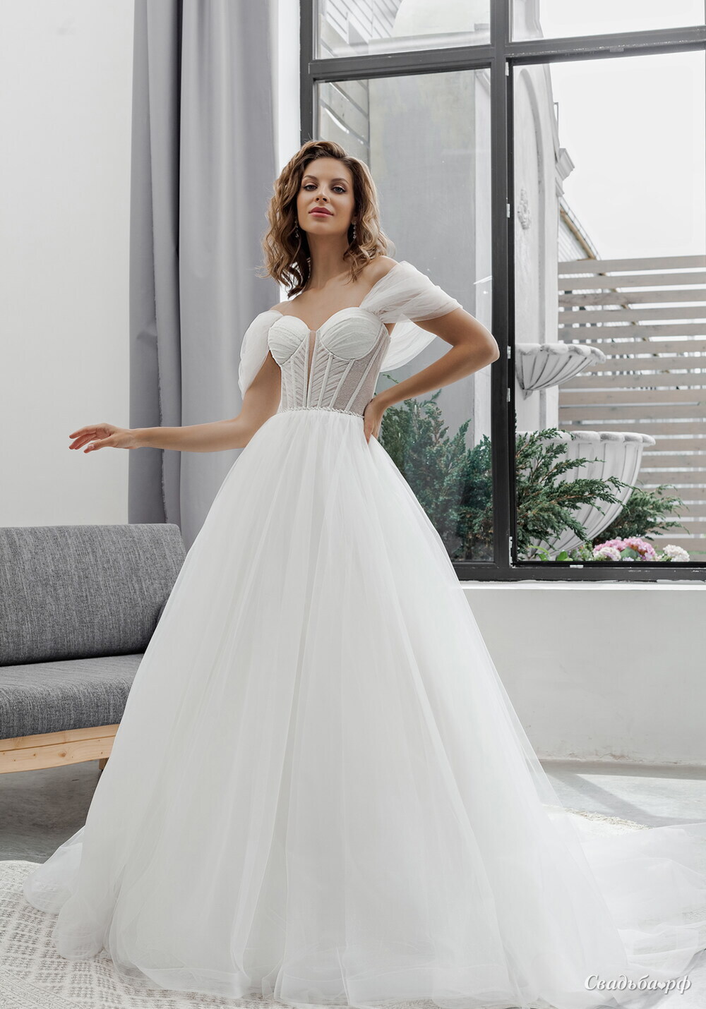 Прелестное воздушное свадебное платье из новой коллекции. Изящный корсет с бельевой чашкой. Тонкая драпировка на прозрачно-блестящем корсете искусно ложится по линии фигуры, талия расшита прозрачными хрусталиками, которые оттеняют блеск корсета. Пышная юбка, выполненная из мерцающего фатина, заканчивается лентой жесткости, которая поддерживает объем платья. Изюминкой этой модели является драпировка по корсету в виде конуса, которая удлиняет корсет. Рукава в виде пышных крылышек из мягкого фатина дополняют образ.