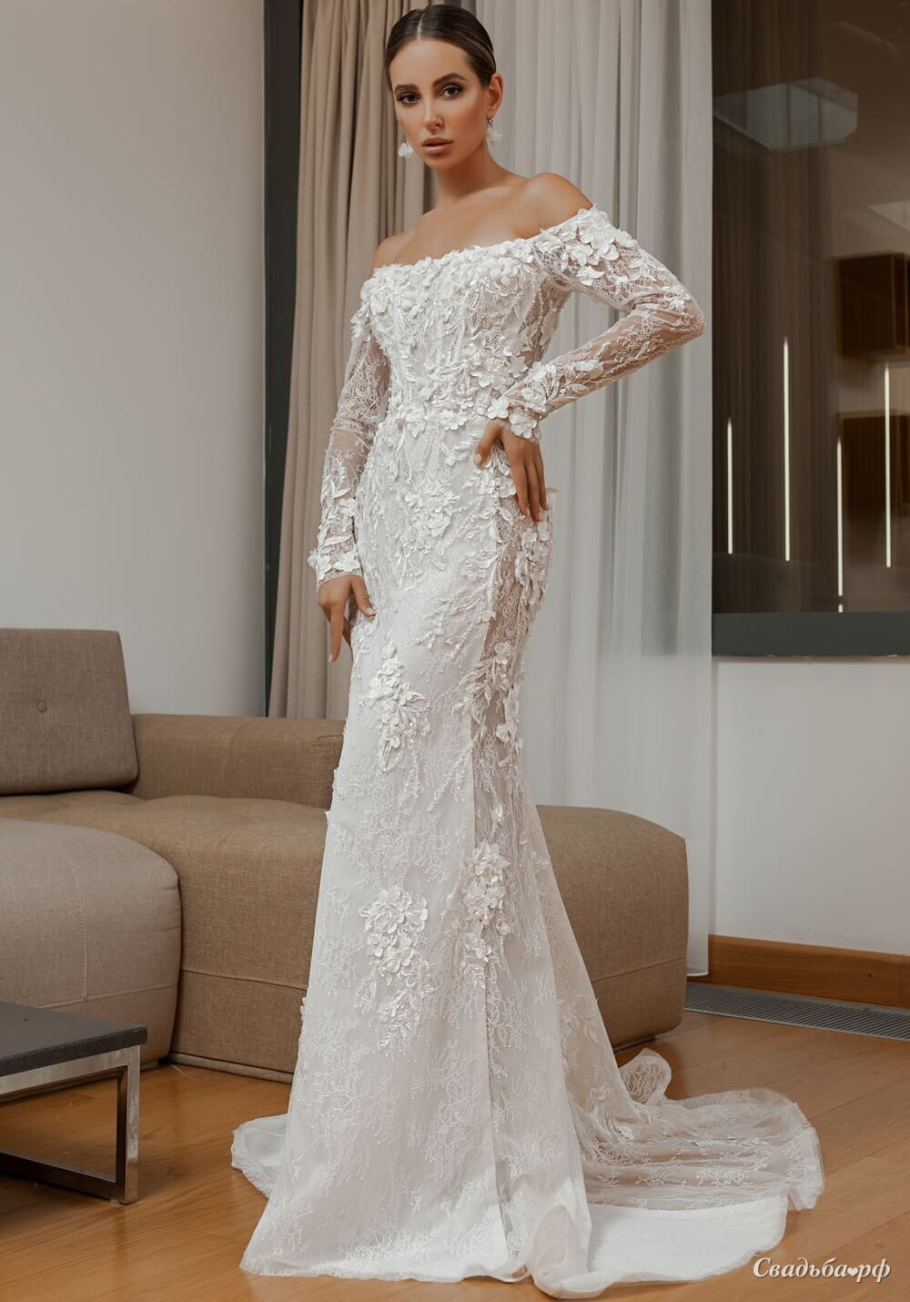 Модель в стиле русалка, которая великолепно подчеркивает все достоинства фигуры. Платье выполнено из 3Д кружева, расшитого цветами. Открытый вырез лодочка подчеркивает линию плеч.
