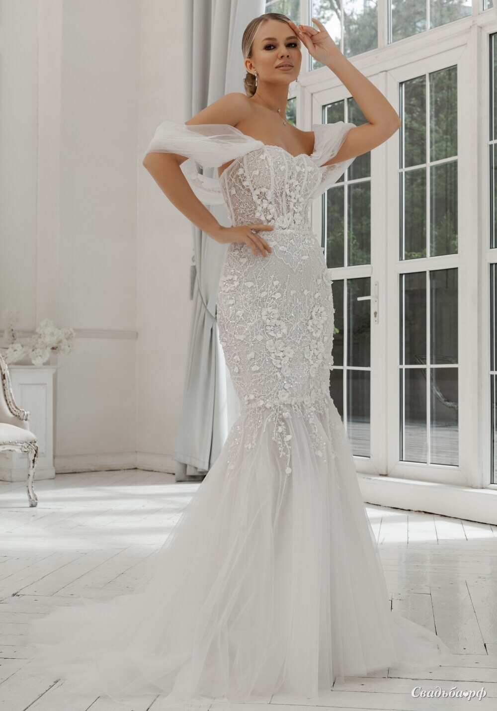 Кружевное платье в силуэте русалка. Полупрозрачный корсет и часть юбки украшена тончайшим кружевом с аппликациями 3Д эффекта. Мягкие фатиновые планки мягко спадают с плеч. Завершает образ пышный фатиновый "хвост" с роскошным шлейфом.