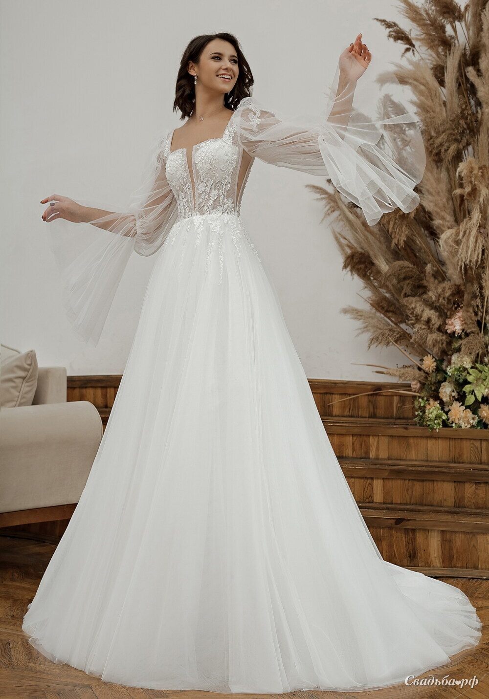 Эксклюзивная модель из новой коллекции. Современный ритм жизни задает тенденции в мире моды, однако некоторые модели платьев для главного торжества остаются неизменными долгие годы, но всегда хочется чего то нового. И эта модель как раз для почитателей нового взгляда на классическое традиционное свадебное платье. Мерцающий корсет с вырезами по бокам и тонкий вырез по середине дополняют друг друга. Объемные аппликации изящно выложены по корсету. Оригинальностью модели являются необычные объемные рукава с тонким фатиновым расклешенным манжетом, отдающим дать стилю историзм.