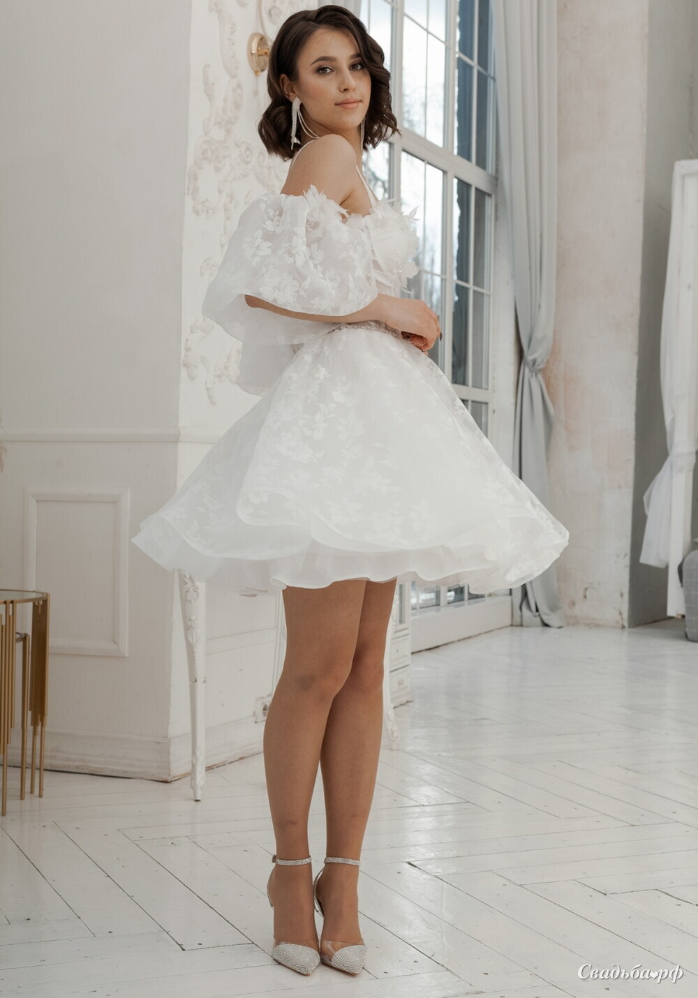 Свадебное платье в длине мини с пышной юбкой. Выполнено в бельевом стиле, подчеркивает зону декольте. Декор из 3Д цветов добавляет особенную легкость и воздушность этой модели. Благодаря такой ткани с оригинальным принтом, платье становится эксклюзивным. Съемные рукава в виде фонарика, создают еще более легкий образ невесты.