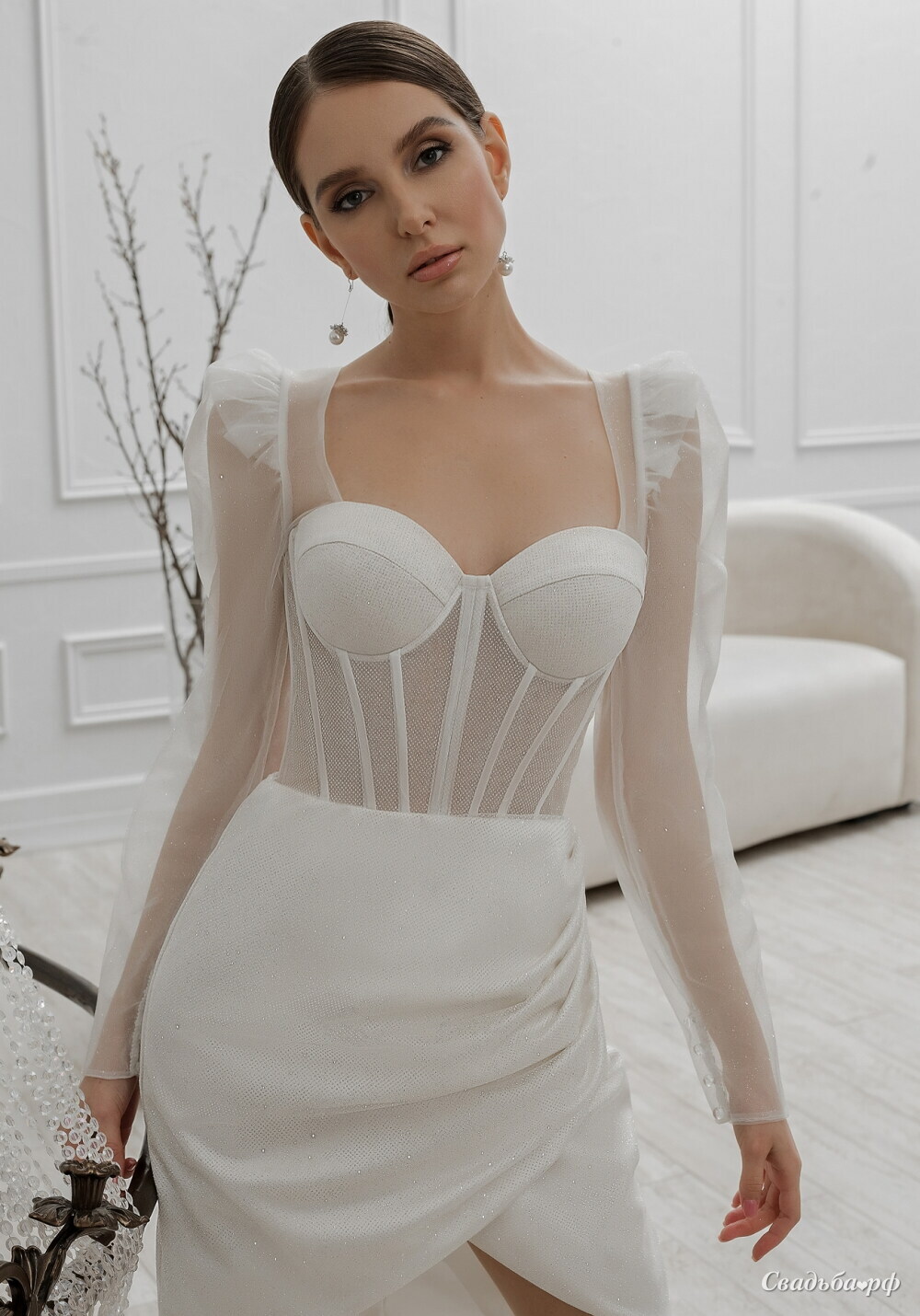 Свадебное платье из новой коллекции Бьюти. Классическое платье-футляр из мерцающего глиттера и атласа. Юбка в стиле тюльпан стройнит и подчеркивает женские формы. Фасон подходит для разного возраста. Лиф с вырезом в виде сердца и бельевой чашкой добавляет романтичности, а длинные прозрачные рукава создают строгость силуэта невесты.