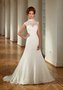 Нежное свадебное платье силуэта «русалка» и вверхом "американка" с высоким воротом, привлекает внимание легким намеком на стиль ретро. Винтажное настроение подчеркнуто текстурой полупрозрачной ткани, закрывающей декольте сердечком. Объемная юбка хорошо оттеняет облегающий верх. Особенно пышной она становится сзади, где переходит в длинный шлейф с ажурным краем. Сзади красивая спинка, украшенная декоративными пуговичками.